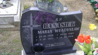 Grób: X.6.7 Banasiuk Maria ur.:25-03-1903 zm.:03-03-1971 Banasiuk Władysław ur.:25-03-1888 zm.:14-07-1973 Banasiewicz Anna ur.:23-02-1976 zm.:25-08-2023 Banasiuk Stanisław ur.:01-11-1928 zm.:09-05-1994 Banasiuk Waleria ur.:22-10-1910 zm.:21-02-2002 |