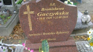 Grób: XIX.18.1 Gaczyńska Bronisława ur.:16-11-1929 zm.:22-08-2010 Rybowska Agnieszka ur.:_ zm.:_ Rybowski Bronisław ur.:_ zm.:_ Gaczyński Adam ur.:11-06-1928 zm.:22-02-2012 |