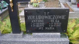Grób: XVII.1.4 Hołubowicz Antoni ur.:29-12-1908 zm.:25-12-1978 Hołubowicz Olga ur.:13-11-1920 zm.:18-06-1993 |