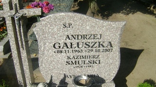 Grób: XVII.26.1 Gałuszka Wojciech ur.:08-02-2011 zm.:08-02-2011 Gałuszka Andrzej ur.:08-11-1963 zm.:29-10-2007 Smulski Kazimierz ur.:18-10-1928 zm.:20-03-1982 |
