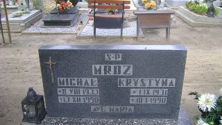 Grób: XVII.31.9 Mróz Krystyna ur.:01-09-1931 zm.:10-01-1990 Mróz Michał ur.: zm.:13-12-1990 |