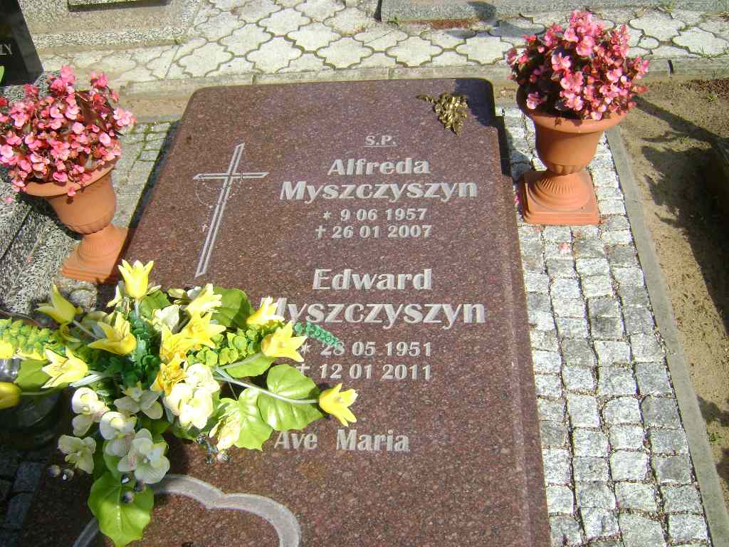 Grób: I.8.3 Myszczyszyn Edward ur.:1951.05.28 zm.:12-01-2011 Myszczyszyn Alfreda ur.:1957.06.09 zm.:2007.01.26 |