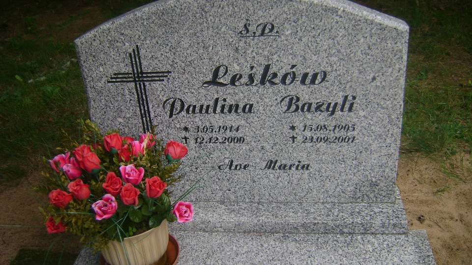 Grób: II.1.1 Leśków Bazyli ur.: zm.: Leśków Paulina ur.: zm.: Leśków Bazyli ur.:15.08.1905 zm.:23.09.2001 Leśków Paulina ur.:03.05.1914 zm.:12.12.2000 Leśków Zenon ur.:23-01-1940 zm.:26-03-2022 |