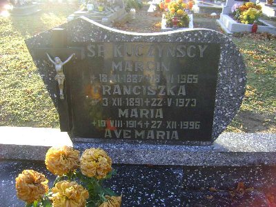 Grób: II.1.5 Kuczyńska Maria ur.:10.08.1914 zm.:27.12.1996 Kuczyńska Franciszka ur.:3.12.1891 zm.:22.05.1973 Kuczyński Marcin ur.:18.11.1887 zm.:19.06.1965 |
