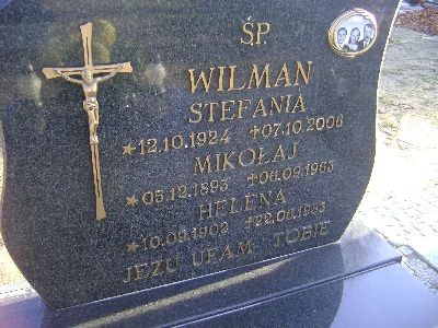 Grób: I.2.27 Wilman Stefania ur.:12.10.1924 zm.:7.10.2006 Wilman Mikołaj ur.:5.12.1893 zm.:6.09.1963 Wilman Helena ur.:10.09.1902 zm.:22.06.1983 |