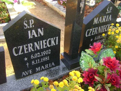 Grób: I.3.17 Czerniecka Maria ur.:6.08.1904 zm.:12.08.1992 Czerniecki Jan ur.:6.02.1902 zm.:8.11.1981 |