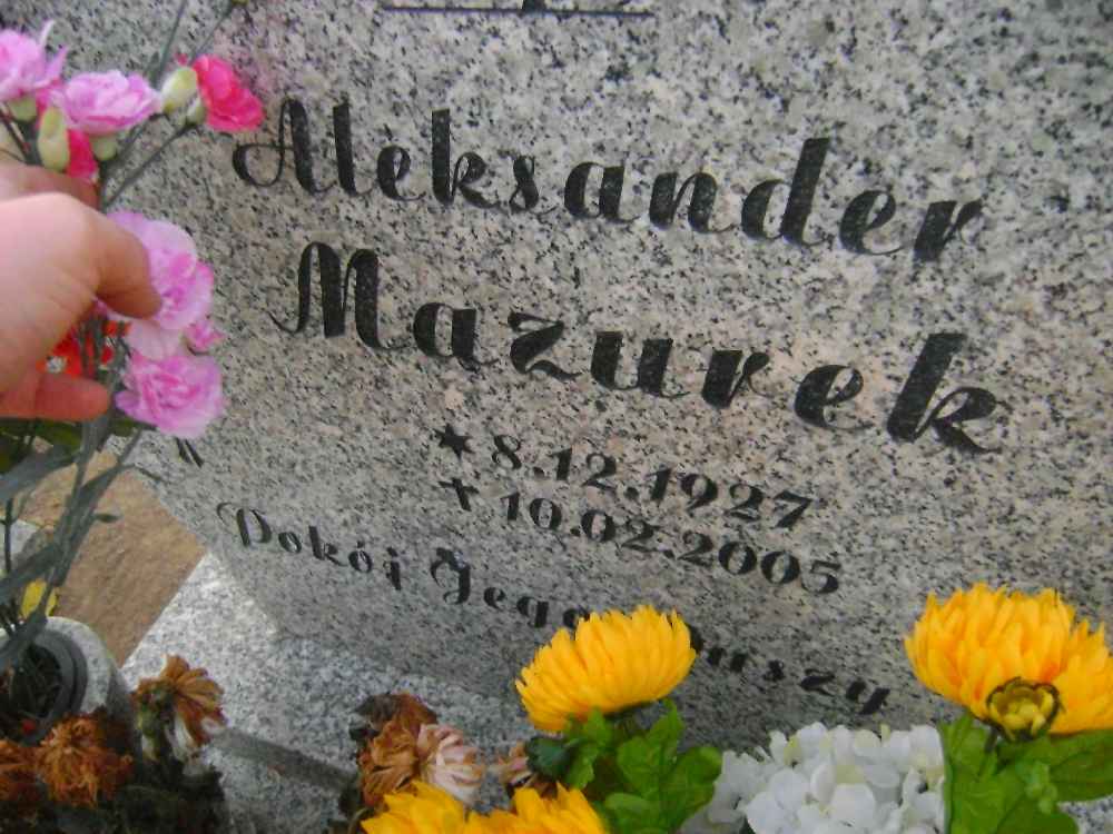 Grób: I.1.18 Mazurek Aleksander ur.:08.12.1927 zm.:10.02.2005 VIII.V po lewejstronie od połowy parkanu |