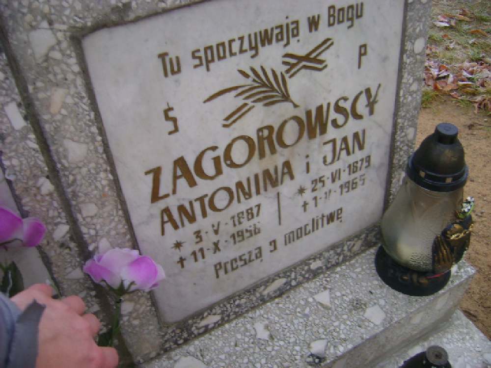 Grób: I.7.2 Zagorowska Antonina ur.:03.05.1887 zm.:11.10.1956 Zagorowski Jan ur.:25.06.1879 zm.:01.02.1965 Zagorowski Henryk ur.:11.07.1917 zm.:13.05.2008 |
