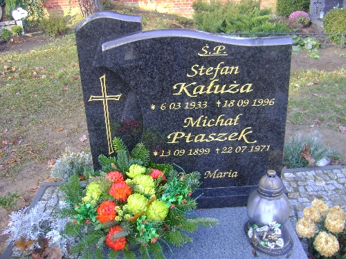 Grób: I.2.21 Kałuża Stefan ur.:06.03.1933 zm.:18.09.1996 Ptaszek Michał ur.:13.09.1899 zm.:22.07.1971 Ptaszek Weronika ur.:16-07-1901 zm.:01-10-1984 Kałuża Helena ur.:25-06-1932 zm.:26-02-2021 |