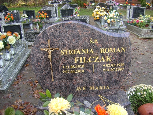 Grób: I.5.6 Filczak Stefania ur.:31.08.1919 zm.:07.04.2010 Filczak Roman ur.:02.02.1920 zm.:31.07.1987 |