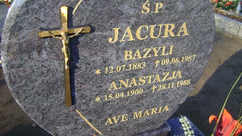 Grób: I.8.35 Jacura Bazyli ur.:12.07.1883 zm.:09.06.1957 Jacura Anastazja ur.:15.04,1900 zm.:28.11.1988 |