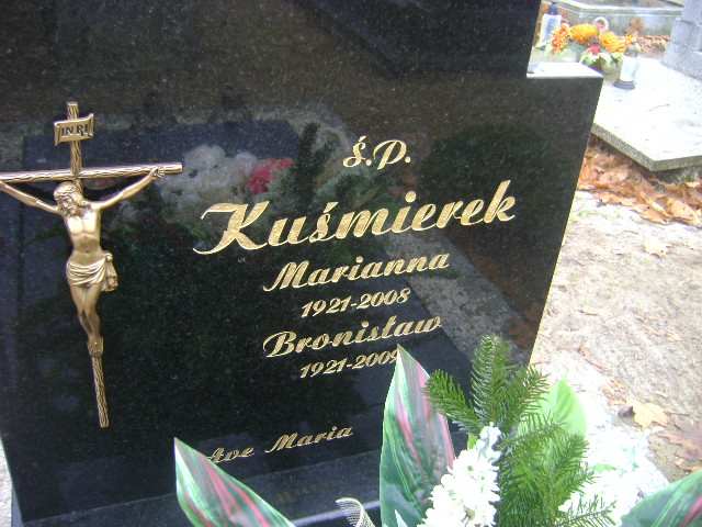 Grób: I.15.10 Kuśmierek Marianna ur.:25.04.1921 zm.:25.01.2008 Kuśmierek Bronisław ur.:24.05.1921 zm.:11.09.2009 |