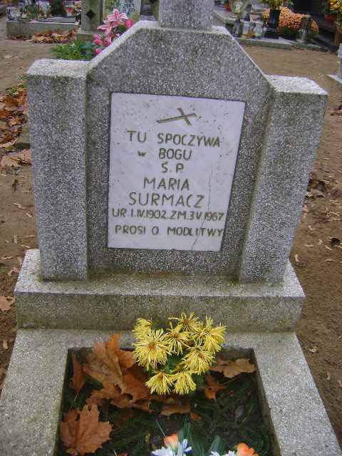 Grób: I.18.9 Surmacz Maria ur.:01.04.1902 zm.:03.05.1967 |