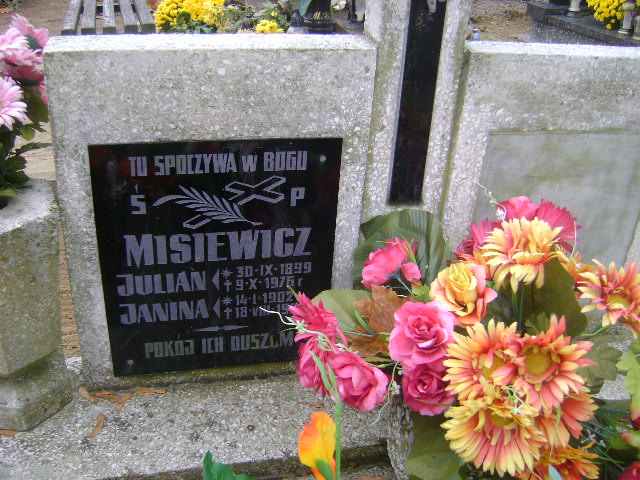 Grób: I.21.12 Misiewicz Janina ur.:14.01.1902 zm.:18.08.19 Misiewicz Julian ur.:30.09.1899 zm.:09.10.1975 |