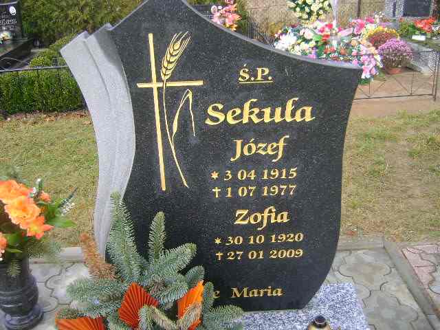 Grób: I.4.14 Sekuła Józef ur.:03.04.1915 zm.:01.07.1977 Sekuła Zofia ur.:30.10.1920 zm.:27.01.2009 |