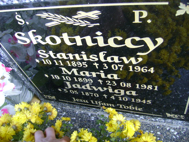 Grób: I.1.8 Skotnicka Maria ur.:10.10.1899 zm.:23.08.1981 Skotnicka Jadwiga ur.:05.05.1870 zm.:04.10.1945 Skotnicki Stanisław ur.:18.11.1893 zm.:03.07.1964 |