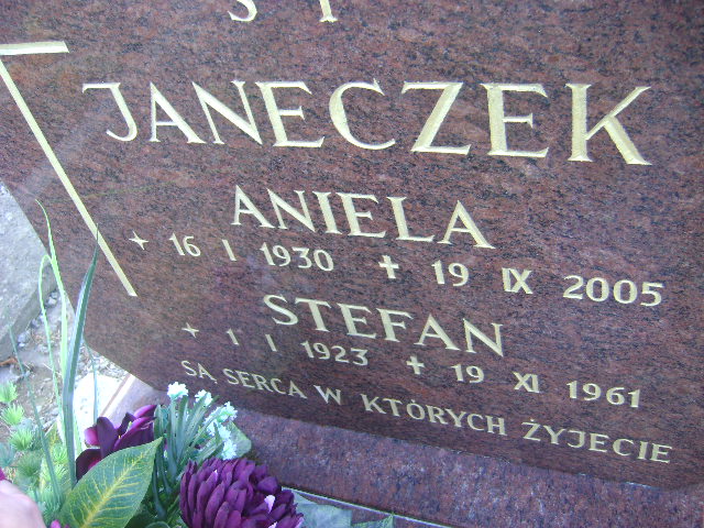 Grób: I.5.23 Janeczek Aniela ur.:16.01.1930 zm.:19.09.2005 Janeczek Stefan ur.:01.01.1923 zm.:19.11.1961 |