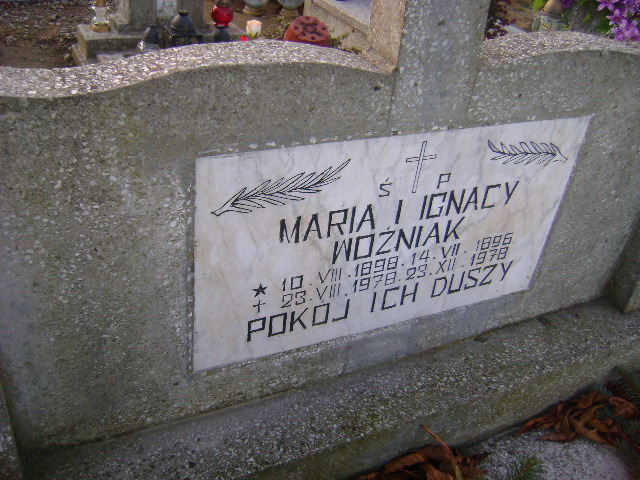 Grób: I.9.24 Woźniak Maria ur.:10.08.1898 zm.:23.08.1978 Woźniak Ignacy ur.:14.07.1896 zm.:23.12.1978 |
