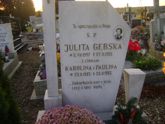 Grób: I.9.49 Gębska Paulina ur.:23.02.1983 zm.:23.02.1983 Gębski Jan ur.:12.06.1905 zm.:24.07.1986 |